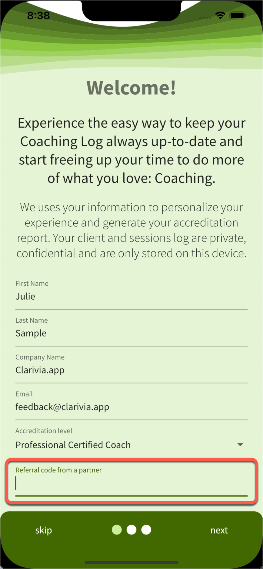 If you got a referral code from a third-party to enable additional sessions per week for free, make sure to enter it in the application either during the first launch of the application - at the bottom of the very first screen you see to enter your information, or from within the preferences.